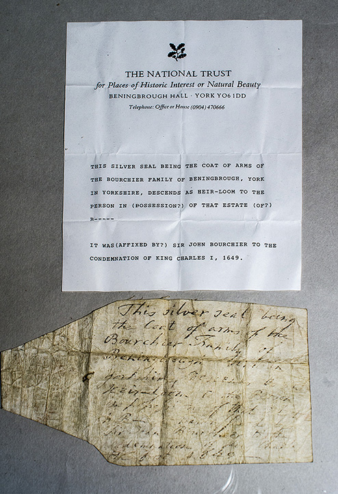 The silver seal which Sir John Bourchier impressed on the death warrant is preserved at Beningbrough Hall, Yorkshire, now in National Trust hands.
